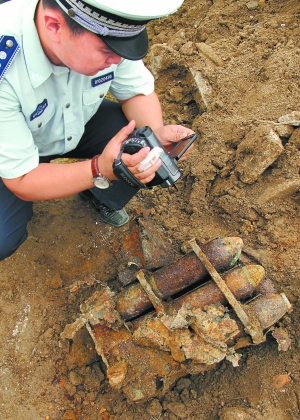 很快,民警在現(xiàn)場拉起警戒線,挖出來的大鐵箱子銹跡斑斑,里面裝有6枚炮彈。隨后,專業(yè)人員對(duì)挖掘出來的炮彈和手雷進(jìn)行了排險(xiǎn)操作。當(dāng)天,工人們又在現(xiàn)場挖出了二三十個(gè)手雷。據(jù)了解,這些爆炸物品均屬解放前遺留。