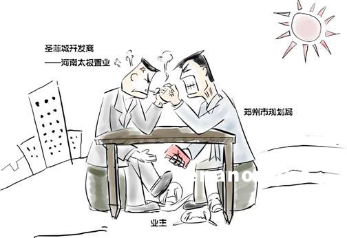河南太極置業(yè)圣菲城4期近千平米違章樓在鄭州市規(guī)劃局執(zhí)法隊(duì)眼皮子底下成天瘋長!而鄭州市規(guī)劃局執(zhí)法隊(duì)“馬拉松”式的執(zhí)法,為這個(gè)違章建筑的拔起贏得時(shí)間。近日,網(wǎng)上熱傳一則漫畫,譏諷了網(wǎng)友眼中的鄭州規(guī)劃局pk圣菲城。