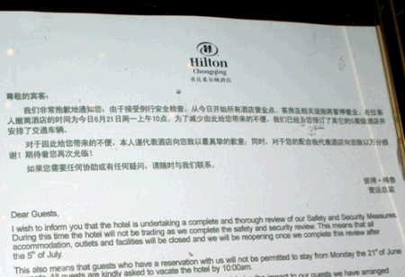 重慶市渝中區(qū)兩路口的希爾頓飯店,其大門緊閉謝客,希爾頓重慶營運(yùn)總監(jiān)彼得。魯格(Peter Rugg)的致歉信被置于酒店門前。