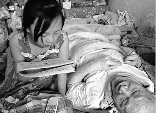 順著讀書聲,記者走進(jìn)小雅慧家,看到了這個扎著馬尾辮、瓜子臉,穿一條褪色紅裙的小姑娘。她一手拿書,一手為姥爺扇扇子,嘴里還抑揚頓挫地念著。小雅慧說,這是第110次給姥爺念課文《陽光》了。念完后,她就跑到廚房,洗菜,燒水,給媽媽做飯。