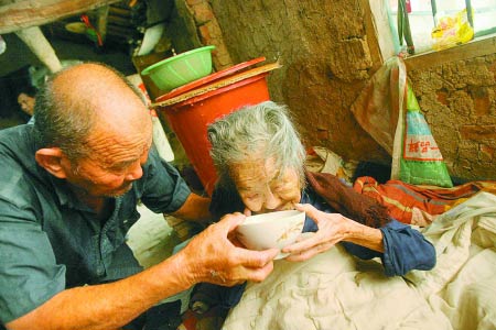 張東明是駐馬店市平輿縣萬(wàn)金店鎮(zhèn)大王莊村民。53年前,17歲的張東明娶了蔡婆婆的獨(dú)生女兒為妻,便把岳母接到了家里。1986年,張東明的妻子去世,46歲的張東明帶著兒女承擔(dān)起了照顧岳母生活的重?fù)?dān)。時(shí)間一晃又過(guò)去了24年,如今,蔡婆婆已是百歲老人,張東明也進(jìn)入了古稀之年。
