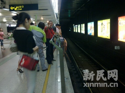 工作人員正俯身下去撈起乘客的物品。新民網(wǎng) 蕭君瑋 中山公園站現(xiàn)場回傳