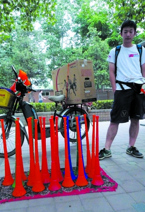 比球迷先到達體育場外的就是這些攤主,有的就地擺張包袱皮,有的打開轎車后備箱,有的邊走邊賣。無論是賣什么東西都講究個吆喝,唯獨賣嗚嗚祖拉,只要吹就行了。工地北門東西數百米的路旁,這些商販排成了長隊。