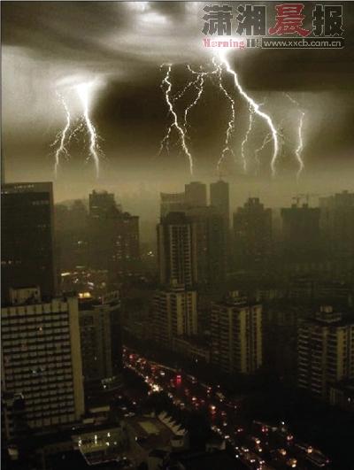 昨日下午2時,一陣電閃雷鳴后,長沙的天空頓時暗了下來,傾盆大雨持續了一個多小時。隨后一張帶有“2010年7月9日下午2:40長沙芙蓉路”字樣的圖片在貼吧里和各個QQ聊天群瘋狂轉載。