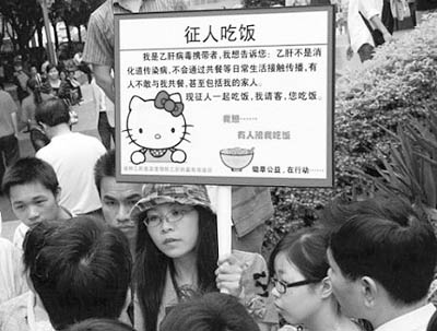 起因是這個女人手中高舉的一塊一平方米見方的白色牌子,上面赫然寫著“征人吃飯”四個大字,大字下面還有一段黑色的小字:乙肝不會通過共餐接觸傳播,我是乙肝病毒攜帶者,現(xiàn)征人一起吃飯,我請客,您吃飯。