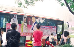 昨日上午10點半,細雨濛濛。南京鼓樓廣場上,一輛74路公交車圍著廣場慢悠悠地繞圈。就在過往路人納悶之際,轉過來的車身解開了謎底,原來是一名億萬富豪搞的征婚秀。只見面向慢車道的車身上,醒目地貼著大幅彩色噴繪寫真橫幅,從左到右依次是白素貞、七仙女、祝英臺的人物劇照。車身上密密麻麻的,是這名富豪的愛情書:一定要找一名集上述三女子優點于一身的人為妻。