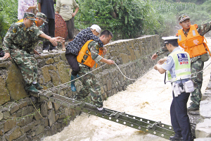 7月7日以來,重慶市東南地區(qū)連日大雨。9日凌晨,一場(chǎng)暴雨突襲渝東南重鎮(zhèn)黔江,武警重慶市總隊(duì)第五支隊(duì)官兵多路出擊。但一座隨時(shí)都有可能垮塌的水泥橋攔住了村民的去路,武警重慶市總隊(duì)第五支隊(duì)二中隊(duì)代理排長(zhǎng)王超在一根繩的幫助下,來回83趟將被困的83名村民全部轉(zhuǎn)移。