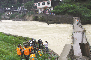 王超立即組織戰(zhàn)友登車趕往現(xiàn)場(chǎng),水米未進(jìn)的官兵只能眼巴巴地把餅干塞回挎包。在凌云寨,一座水泥橋橋墩全部沒入洶涌的河水中,河岸泥土松動(dòng)、護(hù)坡坍塌,電線桿已經(jīng)倒在橋面,橋身出現(xiàn)多處斷裂,并朝下游方向傾斜,隨時(shí)可能被沖毀,受困群眾正在對(duì)岸焦急等待。