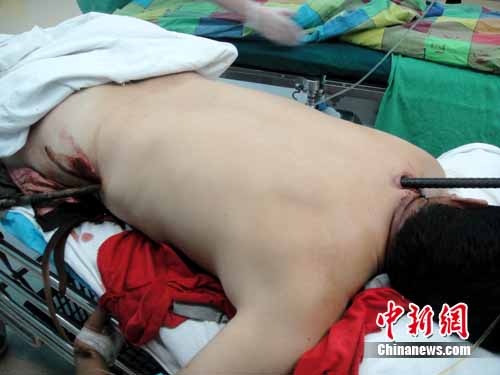 一根長超1米,直徑為2.5厘米的鋼筋從四川一男子的右腰穿進了體內,從身體左側肩胛頸部穿出。劉波 攝