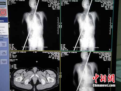 四川男子鋼筋穿身而過的CT圖。劉波 攝