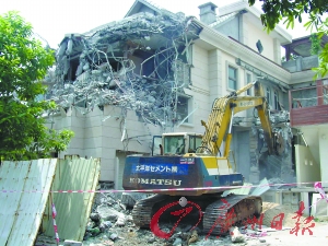 昨日上午,由于目前使用的8米臂長勾機的勾臂長度不夠,不能伸到別墅高處將違建部分拆除,城管部門增調了一臺臂長達到15米的大型勾機到場繼續強拆。