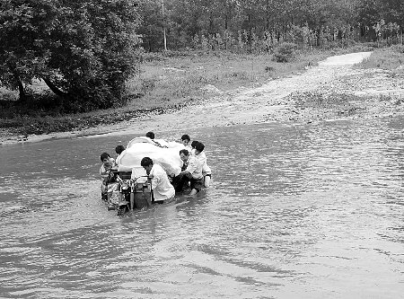 “三輪車剛上路,雨就下大了,瓢潑的一樣!毙吕蓮埢⒄f,三輪車艱難地18次駛過漫水橋來到宋莊時,已是上午8點多了。把艷麗送上花轎,嫁妝裝上三輪車后,艷麗的爹娘看了看天,說:“不行了改改日子。”