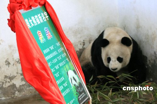 2007年12月30日,濟南動物園,公園管理部門和社會愛心捐助大熊貓的單位等一起為“美女大熊貓”20號舉行隆重的征名揭牌儀式。這只于當年9月28日落戶濟南、譜系號為20號的臥龍大熊貓獲得昵稱“泉泉”,富有濟南特色,象征著她在泉城的美好生活。 被譽為四川臥龍一號美女大熊貓的20號目前在濟南生活良好,社會各界先后為她起了數千個昵稱,經過選拔,最終“泉泉”獲得一致通過。 中新社發 周青先 攝