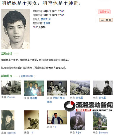 日前,有豆瓣網友號召網友貼出爸媽年輕時候的照片,再現他們的青春風采。活動目前已吸引6000多網友參與,還有人提議評出最帥的爸爸和最美的媽媽。