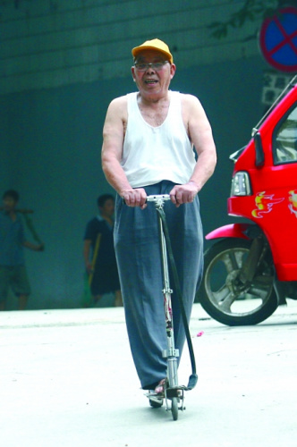穿著一件白色背心和深色短褲,一頂黃色鴨舌帽掩不住花白的頭發,當87歲的李海和大爺腳踩滑板,以這種“拉風”的形象出現在人們面前時,回頭率極高。李大爺自稱踩滑板有七年了,不論是外出游玩,或買菜購物,他都踩著它。