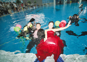 昨天上午十點,當記者走進南京奧體中心游泳館內,只見館內喜氣洋洋,氣球拱門、巨幅結婚照將游泳館裝扮成了婚禮殿堂。當新郎吳春朋和新娘唐梅,手牽著手站在10米跳臺上時,游泳館內發出了一聲聲驚嘆,不少游泳的市民湊上來看熱鬧。