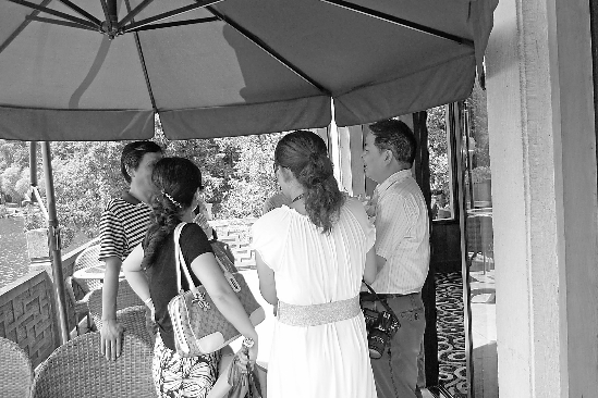 來到19年前跳水救人的現場,項先生(右一)依然很低調。他不愿正面面對鏡頭,這是本報記者偷拍下的一張照片。