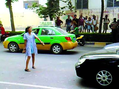 上午10時40分,女孩跑到一旁拿了路邊的磚塊,不停地往路中央扔,很多車見狀不敢前行。后來她干脆拎著兩塊磚,堵住高檔私家車!氨凰[得都堵車了,堵了100米,有五六分鐘。”目擊者姚先生說。一個婚禮車隊被堵住,一女士下車和她理論,兩人扭打在一起。姚先生說,女孩后來被兩個男的推倒,可能是摔疼了,跪在地上不停地哭。11時,民警趕到后將其帶走。