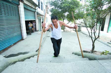 李亞明只能靠兩根棍子支撐行走 記者 張路橋 攝