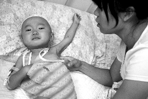 昨日,小宇高燒不退,躺在病床上煩躁不安,母親守在旁邊不斷哄他開心。記者 吳江 攝