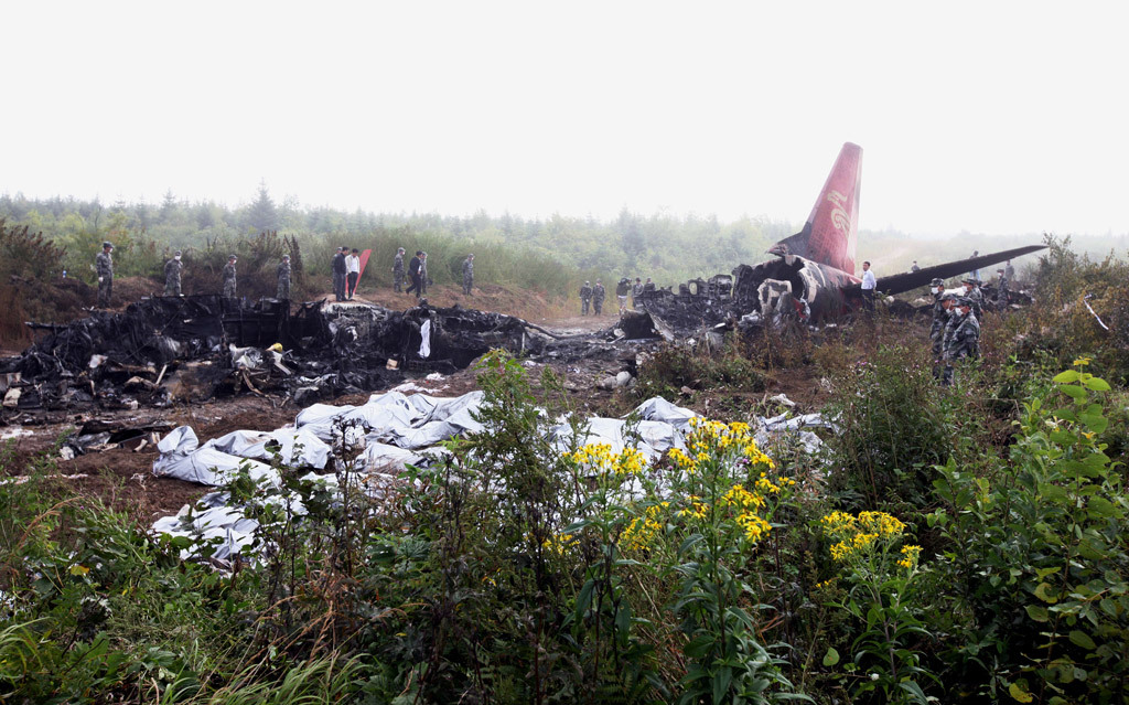 8月25日,黑龍江伊春飛機失事現場,遇難者的遺體已經收集到了一起。