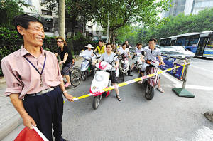 在這個路口的東南角,記者看到一位50多歲的協管員,他在這里干了三年多,第一次對著這么多路人拉起繩子還是有些不好意思。當日下午4:30,交警的中隊長告訴他在路口開始試行拉起警戒繩,并叮囑一旦市民有疑問,要耐心告訴大家這是為了交通安全。于是他就把警戒線一頭拴在欄桿上,一頭握在手里。每次紅燈亮起,警戒線擋住騎車人前進的路時,一位位市民安靜地在警戒繩內等待著。記者在這個路口15分鐘,沒有一位市民闖紅燈。但這一來就苦了協管員,他伴著紅燈拉起警戒線,每55秒一個來回,他說:“這樣算來,一個小時,至少120趟,每天6小時,要到近800趟,真是‘超級減肥運動’。”