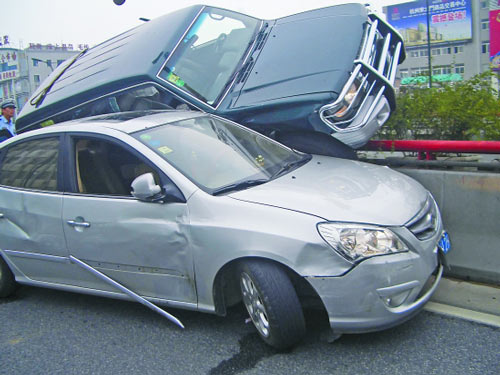 昨天清晨,杭州艮秋立交上面,發(fā)生了一起車禍,一輛“獵豹”爬到了立交橋的護(hù)欄上,左前輪懸在半空,獵豹下面還壓著一輛銀色的現(xiàn)代小轎車。