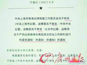 據(jù)圖示,文件為滬教紀[2003]8號文。文件名是:中共上海市教育紀律檢查工作委員會關(guān)于轉(zhuǎn)發(fā)《中共上海市紀委 監(jiān)察委關(guān)于轉(zhuǎn)發(fā)〈中共中央紀委 監(jiān)察部關(guān)于轉(zhuǎn)發(fā)〈北京市紀委 監(jiān)察局關(guān)于嚴明紀律確保非典型肺炎防治工作順利進行的緊急通知〉的通知〉的通知>的通知》