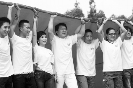 資料圖片:成龍率隊(duì)與北川中學(xué)千名師生共展巨幅國(guó)旗。