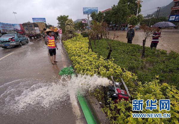 9月2日,福建省漳州市迎賓大道上出現(xiàn)大面積積水,搶險(xiǎn)救援人員運(yùn)來(lái)抽水機(jī)緊急排水。新華社記者姜克紅攝