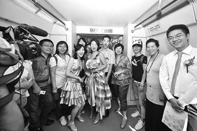 8月28日,北京,一對新人一改平常的婚車車隊接親,以騎自行車,換城鐵、地鐵的方式到達婚禮現(xiàn)場,舉辦了一個綠色、時尚的婚禮。王勉 攝