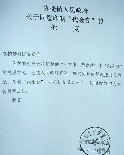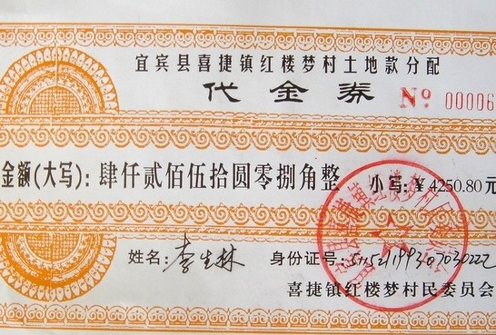 四川宜賓喜捷鎮紅樓夢村的村民近日向中國之聲反映,當地村委會把多年來拖欠農民的400萬元土地款印成了精美的代金券,替代人民幣發給了農民。這些代金券可以在本村內轉讓、贈予,還可以繼承。但如果想換成真錢卻要等到60多歲。記者調查發現,400萬代金券的背后,還隱藏著更大的玄機。