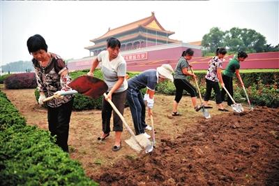工人開始疏松土壤,為花壇布置做準(zhǔn)備。記者王磊攝