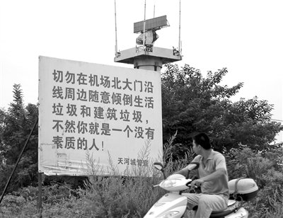 黃陂天河鎮的城管部門,天河機場北大門路旁豎起一面標語:“切勿在機場北大門沿線周邊隨意傾倒生活垃圾和建筑垃圾,不然你就是一個沒有素質的人”,讓不少過往旅客大跌眼鏡。作為警示標語,這樣的遣詞造句確實值得商榷。(高星)