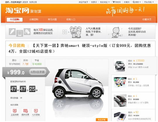 據(jù)了解,除了團購活動,奔馳還提供一輛SMART車供淘寶用戶進行1元秒殺。同時提供150輛SMART車模,供用戶以1元的價格進行團購。