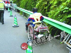 原來,10日晨8時15分左右,一名司機向六大隊報警說,臨近渝黔高速公路東溪段往貴州方向的天平丘隧道,他發(fā)現(xiàn)所有車突然慢下來——原來,路上有個穿反光背心的殘疾中年男子,正吃力駕駛1輛手搖三輪車緩行。駛?cè)刖徤掀虏痪,男子累得滿頭大汗,索性下車手撐三輪車尾,用幾乎半跪半爬方式推車。