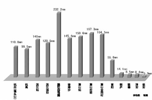 杭州的最大降雨出現在濱江的白馬湖站,3小時內就下了218.9mm,達到了大暴雨級別。