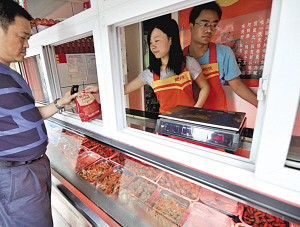 劉卓負責站柜臺!八夂,就算有一兩個挑剔的顧客,她一笑,別人就不好發火了!眲⒆渴且粋很清秀的女孩,笑起來甜甜的。賣鴨脖子其實利潤并不高,10塊錢的鴨脖子,只能掙2塊錢,再遇上幾個要求“抹去零頭”的顧客,掙的就更少了!俺シ孔,還有一個月得七八百的水電費,一年還要交8000塊的加盟管理費。起步的確蠻難的!遍Z振綱說。