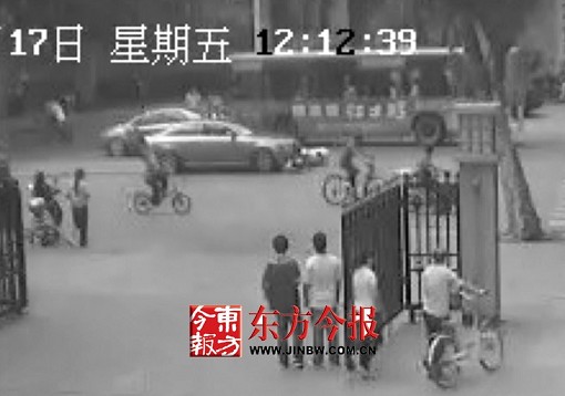 12時12分30秒,一男子騎電動車由東向西橫穿家屬院門口的斑馬線時,被一輛奧迪轎車撞倒。