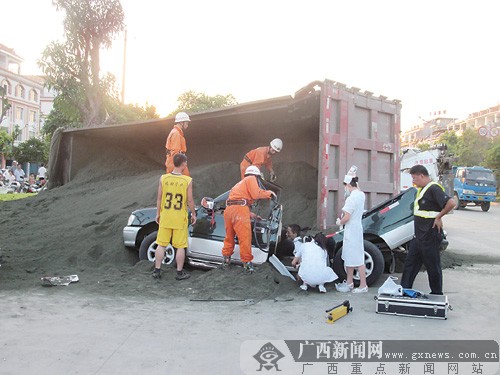9月18日下午6時許,在田東縣東寧路大西南十字路口,一輛運(yùn)送沙石的大貨車側(cè)翻壓住一輛皮卡車,皮卡車上的5人當(dāng)場死亡。