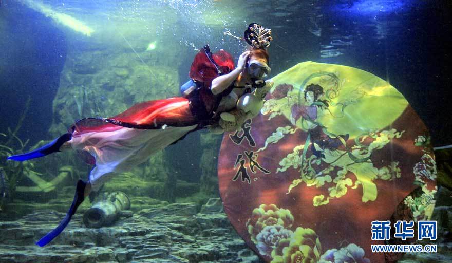 9月22日,扮作“嫦娥”的女潛水員在海底暢游。當日是傳統中秋佳節,武漢東湖海洋世界的女潛水員穿上古裝扮作“嫦娥”,為節日里前來參觀的游客獻上一幕海底“嫦娥奔月”的演出。新華社發(王振武 攝)