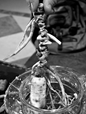 昨日,梁先生向記者展示了這些“奇怪”的人參。比較一下,正常生長(zhǎng)的人參上的須條不容易被擰斷,擰斷后顏色是白色的,而粘上去的人參,接觸表面硬且光滑。