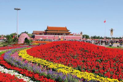 今年“十一”是共和國61歲生日,北京天安門廣場(chǎng)被鮮花裝扮得五彩繽紛,呈現(xiàn)一派節(jié)日氣氛。