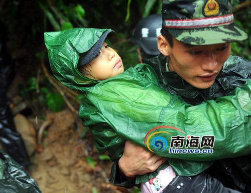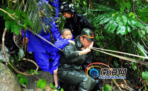 武警救援人員將一名小孩抱下山。(南海網記者汪德芬攝)