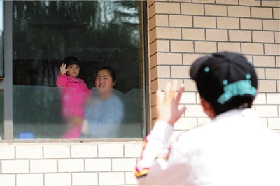 兄妹都要住院,母親抱著女兒與窗外的兒子揮手作別。