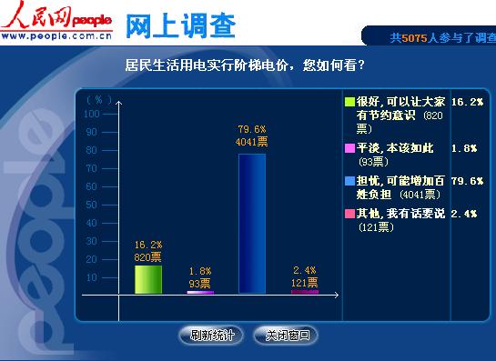 截至9日22時共5075人參與了調查,其中79.6%共4041名網友表示“擔憂,可能增加百姓負擔”;16.2%的網友,共820人表示“很好,可以讓大家有節約意識”;還有93名網友表示“平淡,本該如此”;最后,還有2.4%共121名網友表示“其他,我有話要說”。