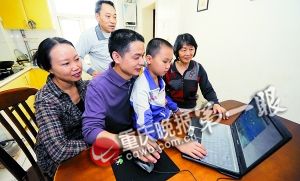 李波一家老小圍坐在電腦前,測試他才開發(fā)的一款小游戲。 記者 冉文 攝