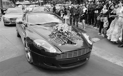 “來了,來了!”中午12時(shí)許,長(zhǎng)長(zhǎng)的車隊(duì)從遠(yuǎn)處駛來,前面的黑色婚車竟是價(jià)值470萬元的阿斯頓馬。〉吕尚履飬s沒有按傳統(tǒng)“躲”在豪車?yán)铮钦驹诹似浜笤鷿M了粉色蓮花、長(zhǎng)七八米的花車上!接著,15輛奔馳車緩緩經(jīng)過紅地毯,看得眾人眼睛發(fā)直。