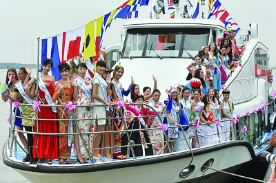 即將參加南京“名城會”全球生態小姐世界大會頒獎的62個國家和地區的佳麗們,登上游輪成為創新旅游路線的第一批游客。 劉 瀏 攝
