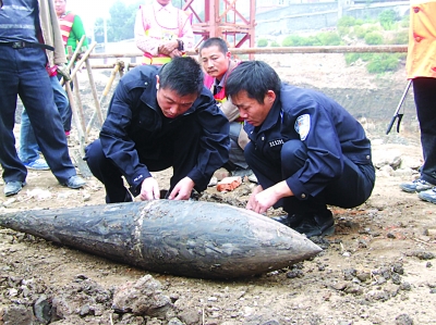 警方介紹,發現有炸彈后,施工人員當即報警,鎮江市公安局特警支隊排爆民警迅速趕至現場。專業民警輕輕刮去淤泥,初步查看后發現:該炸彈長約1.7米,重約150公斤,彈頭尖銳彈體成流線形,幾乎沒有絲毫銹蝕。彈體上有“一黃二白”三條色帶,彈尾處裝有一銅質引信,整個彈體完好無損, 昨晚,記者從鎮江市公安局獲悉,已經確認該彈為抗戰時期侵華日軍遺留下來的航空穿甲彈。(羅金芳 賴靜群 萬凌云)